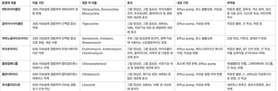 단백질 합성 억제제 항생제들은 다양한 세균에 대해 효과적이나, 내성 기전과 부작용에 대한 관리가 중요합니다. 각 계열은 특정한 세균에 더 효과적이며, 임상적 상황에 맞는 선택이 필요합니다.
