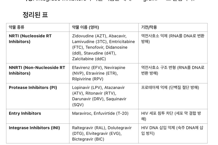 특징: Integrase Inhibitors의 약물 이름은 대개 **”-gravir”**로 끝납니다.
