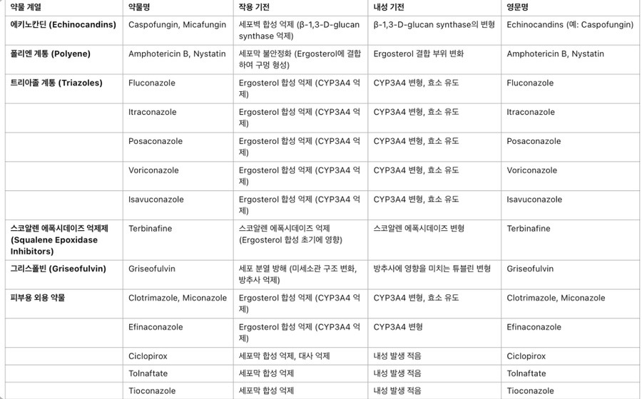 각 항진균제의 기전, 내성, CYP 효소와의 상호작용 등을 정리합니다. 여기서 CYP 효소는 Cytochrome P450 효소군으로, 포유동물에서 약물 대사, 호르몬 합성, 지방 대사 등 다양한 생리적 과정에 관여하는 중요한 효소입니다. 항진균제는 이 효소와 상호작용하여 다른 약물의 대사에 영향을 미칩니다.